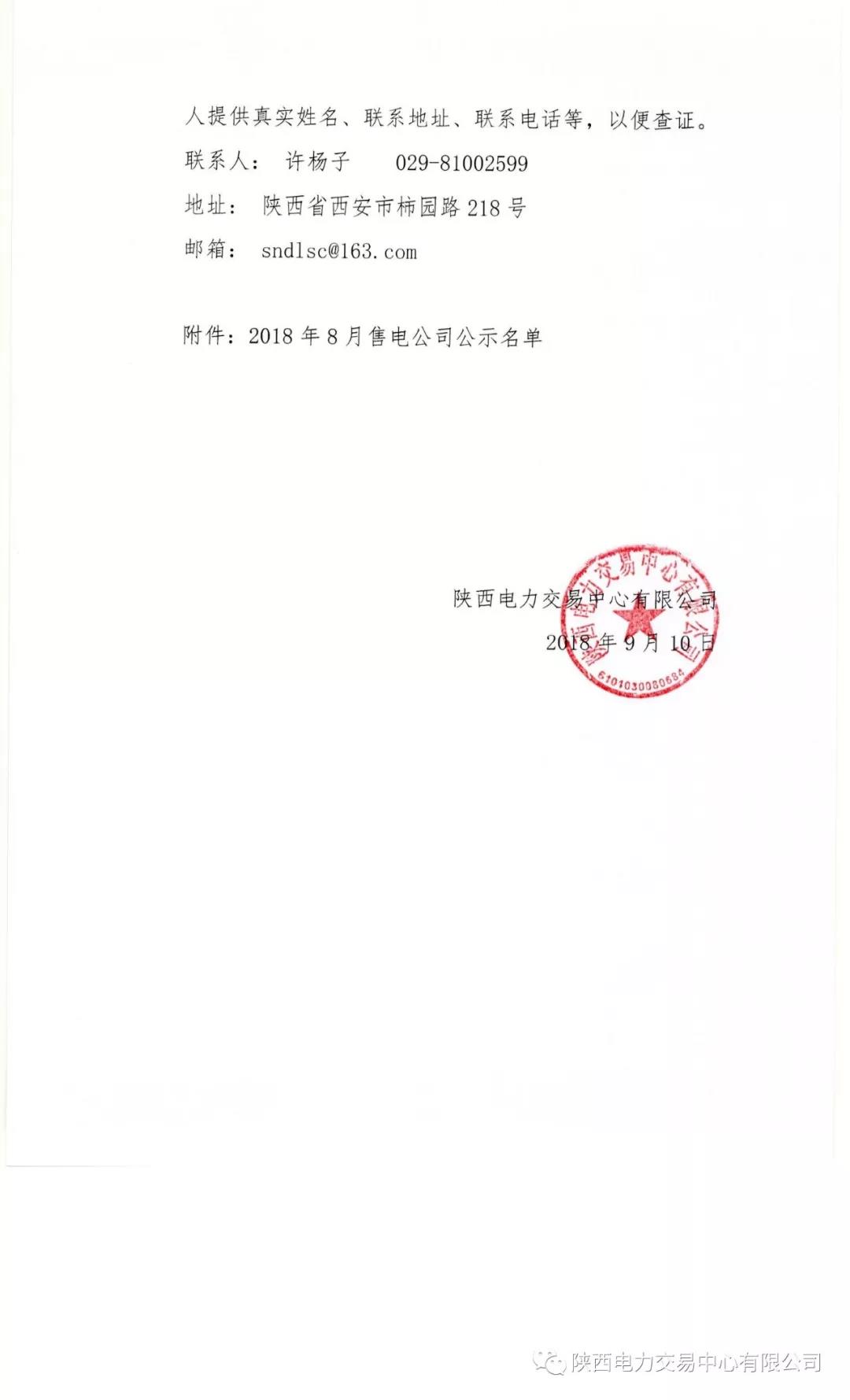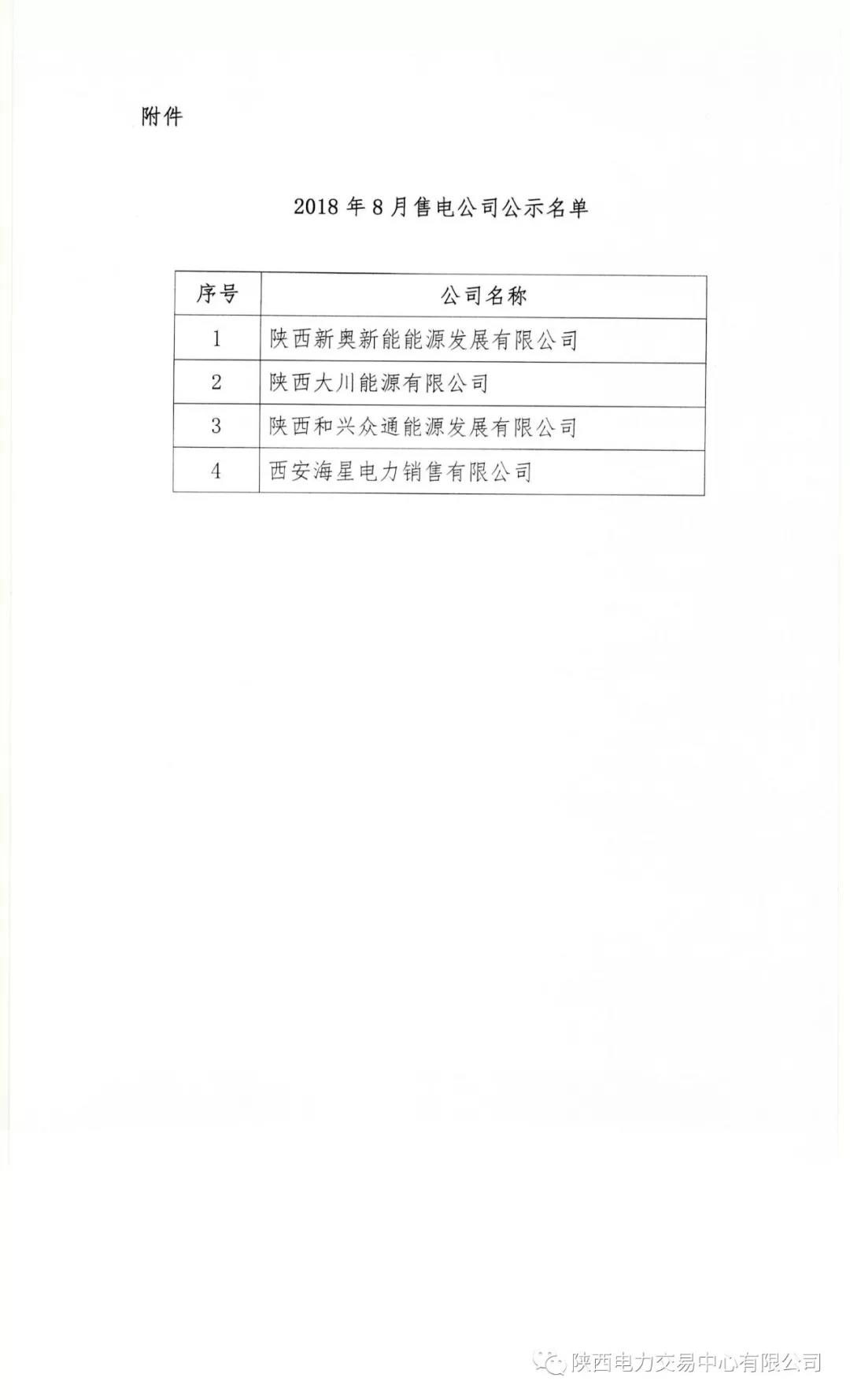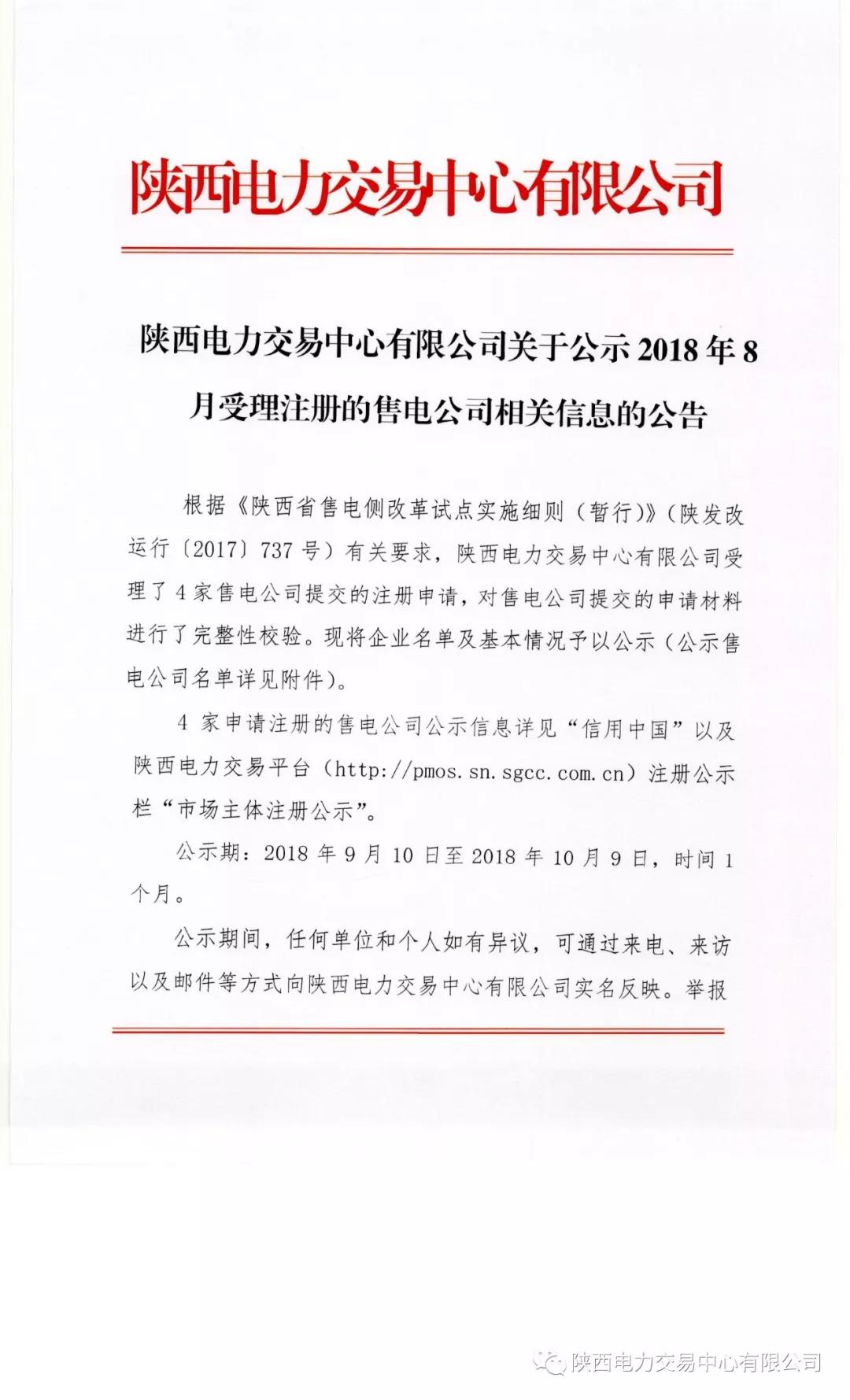 陜西電力交易中心有限公司關(guān)于公示2018年8月受理注冊(cè)的售電公司相關(guān)信息的公告