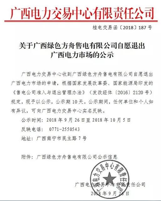 廣西電力交易中心日前發(fā)布了《關(guān)于廣西綠色方舟售電有限公司自愿退出電力市場的公示》,公示時間為9月26日至10月5日。詳情如下: