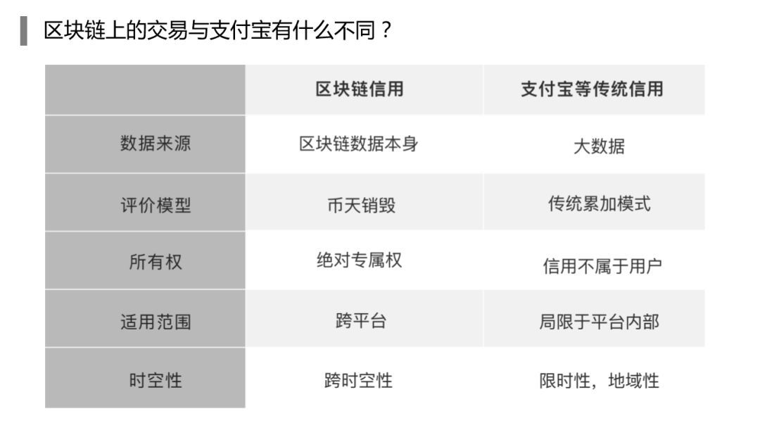 這張表格可以解釋一下區(qū)塊鏈的信用和支付寶等傳統(tǒng)信用的不一樣,剛才說(shuō)了區(qū)塊鏈的信用是基于區(qū)塊鏈技術(shù)本身不需要大數(shù)據(jù)。