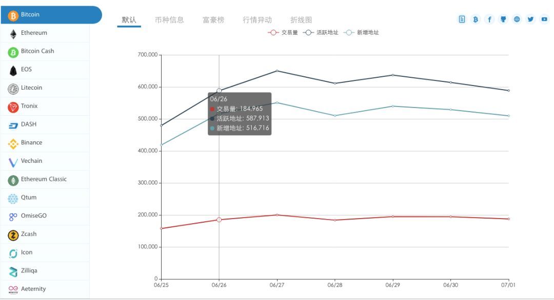 提供包括比特幣 BTC、比特幣現(xiàn)金 BCH、ETH、萊特幣 LTC、Zcash 和門羅幣 Monero 的數(shù)據(jù)和圖表。圖表對比工具可以用來比對比特幣哈希率、交易量、交易費用、活躍地址等等。也提供市場和價格聯(lián)動數(shù)據(jù)。