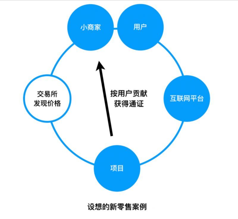 假設(shè)?種場景,在線下,某新零售技術(shù)服務(wù)公司為零售商提供軟件平臺。通常,說服商家加?的理由包括:便利性,低費率(甚?免費),客流導(dǎo)流,導(dǎo)入廣告(獲得分成收?)等。技術(shù)服務(wù)公司則通過增值服務(wù)獲得收益。引?通證后,商家可按交易量獲得通證,分享平臺增長的長期收益。
