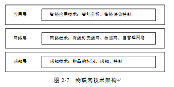 物聯(lián)網(wǎng)的技術(shù)架構(gòu)包括應(yīng)用層、網(wǎng)絡(luò)層和感知層。應(yīng)用層是物聯(lián)網(wǎng)和用戶的接口,實(shí)現(xiàn)物聯(lián)網(wǎng)的智能應(yīng)用;網(wǎng)絡(luò)層(也稱為傳輸層)由各種網(wǎng)絡(luò)和管理系統(tǒng)組成,負(fù)責(zé)傳遞和處理感知層獲取的信息;感知層由各種傳感設(shè)備和網(wǎng)關(guān)組成,包括RFID標(biāo)簽和讀寫器、溫度傳感器、二氧化碳濃度傳感器、濕度傳感器、攝像頭、GPS、二維碼標(biāo)簽等感知終端,主要作用是物體的識(shí)別、信息的采集和簡單處理。物聯(lián)網(wǎng)技術(shù)架構(gòu),如圖2-7所示。