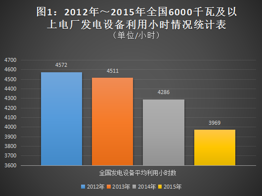 如圖1所示,全國(guó)6000千瓦及以上電廠發(fā)電設(shè)備累計(jì)平均利用小時(shí)數(shù)逐年降低,2012年為4572小時(shí),2013年為4511小時(shí),2014年為4286小時(shí),2015年為3969小時(shí),其中2014年和2015年均連續(xù)破1978年以來(lái)的最低水平。