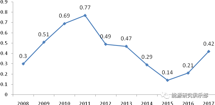 圖1-10 2008~2017年能源消費(fèi)彈性系數(shù)