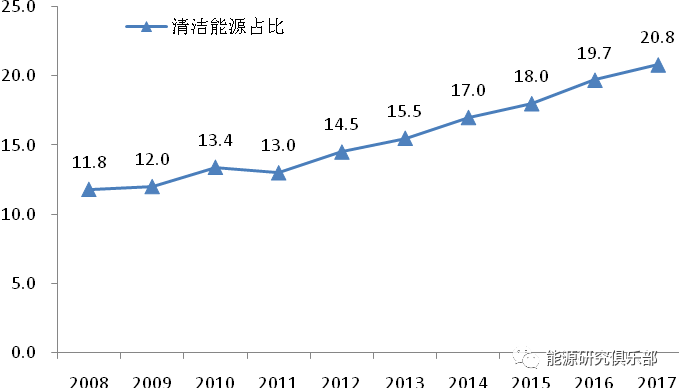 圖1-8 2008~2017年清潔能源消費(fèi)量占能源消費(fèi)總量的比重(單位:%)