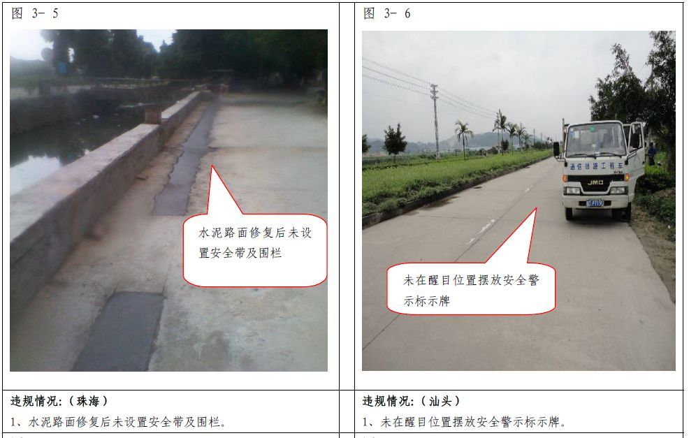 問題描述:水泥路面有進行修復,水泥與沙石混合比例符合標準。但是修復范圍未設置安全帶及圍欄。