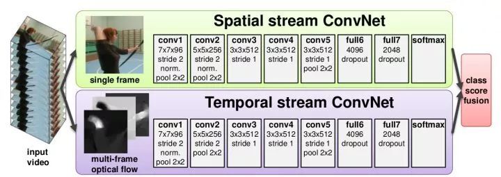 圖像+時(shí)序兩分支結(jié)構(gòu) 這類方法用兩個(gè)獨(dú)立的網(wǎng)絡(luò)分別捕獲視頻中的圖像信息和隨時(shí)間運(yùn)動(dòng)信息。其中,圖像信息從單幀靜止圖像中得到,是經(jīng)典的圖像分類問(wèn)題。運(yùn)動(dòng)信息則通過(guò)光流(optical flow)得到,其捕獲了目標(biāo)在相鄰幀之間的運(yùn)動(dòng)情況。