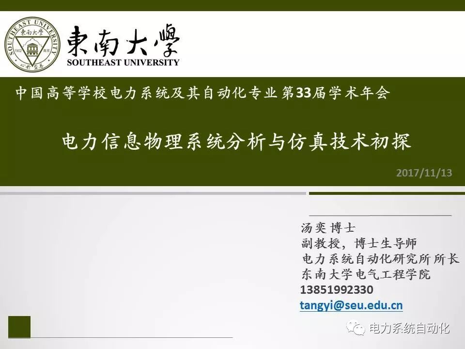 中國高等學(xué)校電力系統(tǒng)及其自動(dòng)化專業(yè)第33屆學(xué)術(shù)年會(huì)日前在沈陽召開,東南大學(xué)湯奕副教授在“能源互聯(lián)網(wǎng)分論壇”上作了題為“電力信息物理系統(tǒng)分析與仿真技術(shù)初探”的專題報(bào)告。小編征得專家同意,在此分享報(bào)告PPT,歡迎品讀。