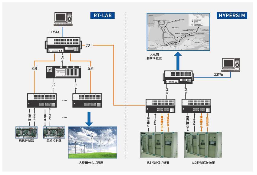 該系統(tǒng)方案結(jié)合了科梁公司RT-LAB及Hypersim兩大旗艦實(shí)時(shí)仿真平臺(tái)的優(yōu)勢(shì),其中借助HyperSim強(qiáng)大的大規(guī)模電力系統(tǒng)仿真能力和優(yōu)勢(shì)以仿真?zhèn)鹘y(tǒng)直流及特高壓直流輸電,而借助RT-LAB特有及專業(yè)的電力電子仿真能力模擬大規(guī)模分布式風(fēng)電場(chǎng),考慮合適的解耦位置,兩者通過(guò)高速光纖通訊進(jìn)行自然解耦,從而完成大規(guī)模分布式風(fēng)力發(fā)電經(jīng)直流外送并入大電網(wǎng)場(chǎng)景的精準(zhǔn)而有效的實(shí)時(shí)仿真模擬,開展系統(tǒng)級(jí)的關(guān)鍵技術(shù)問(wèn)題研究。