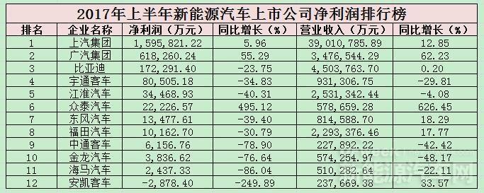 2017年上半年新能源汽車上市公司凈利潤排行榜